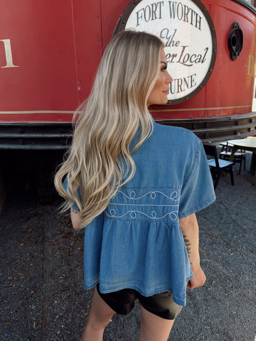 Elevate your style with the Macee Top, a denim flare short sleeve button-up that exudes casual elegance. Perfect for sunny days, its unique design ...