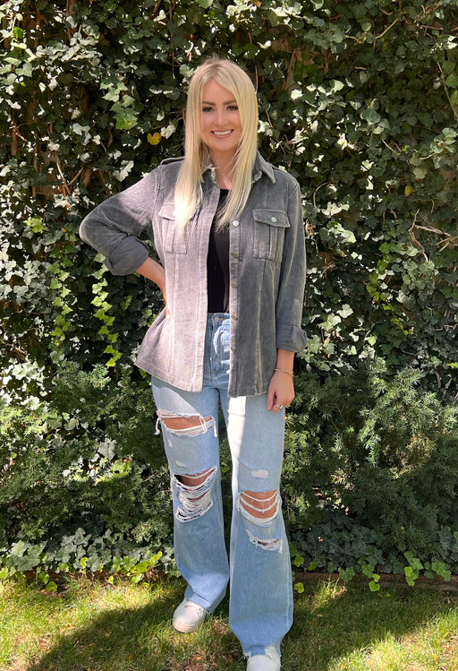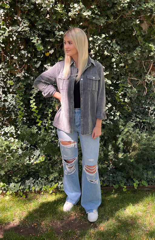 Corduroy button down charcoal jacket *Model is 5'8" wearing a size medium (Models breast B model wears size medium in relaxed fit size large in fi...