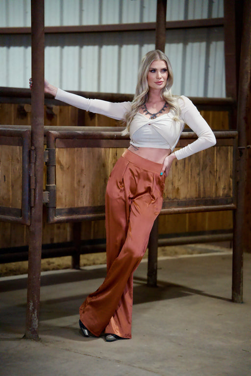 solid satin rust wide leg pants with pockets! MODEL WEARING SIZE SMALL MODEL MEASUREMENTS Breast: 35.5 Waist: 26.5 Hips: 32 Height: 5’7