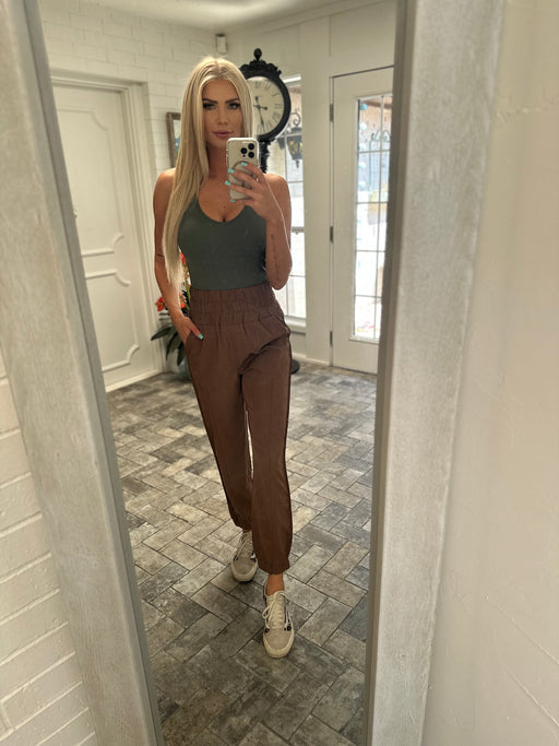 Chestnut activewear high waisted joggers! MODEL WEARING SIZE SMALL MODEL MEASUREMENTS Breast: 35.5 Waist: 26.5 Hips: 32