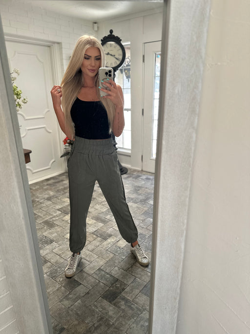 Olive activewear high waisted joggers! MODEL WEARING SIZE SMALL MODEL MEASUREMENTS Breast: 35.5 Waist: 26.5 Hips: 32