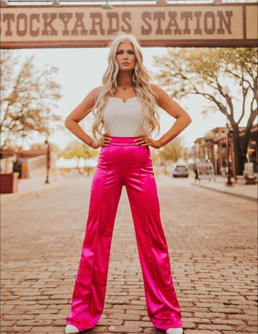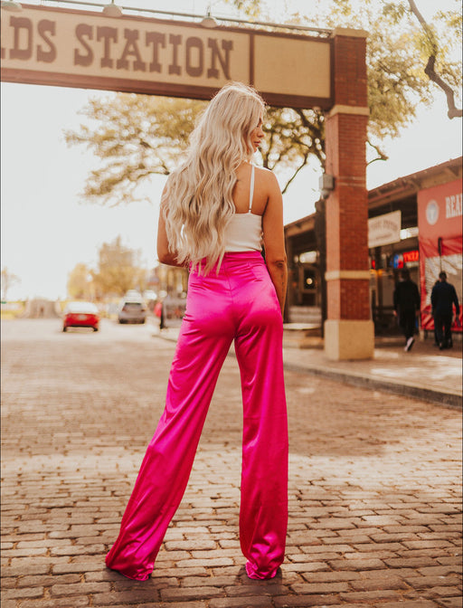 High rise hot pink dress pants with zipper and back! MODEL WEARING SIZE SMALL MODEL MEASUREMENTS Height: 5’7 Breast: 35.5 Waist: 26.5 Hips: 32