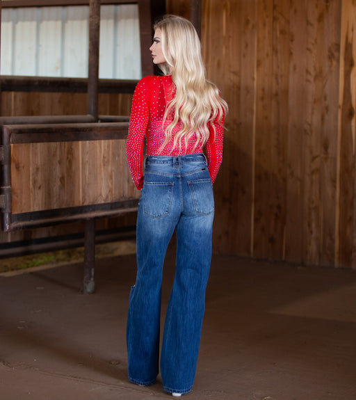 High rise wide leg kanCan jean! MODEL IS WEARING A SIZE 25 MODELS MEASUREMENTS Height: 5’7 Bust: 35.5 Waist: 26.5 Hips: 32