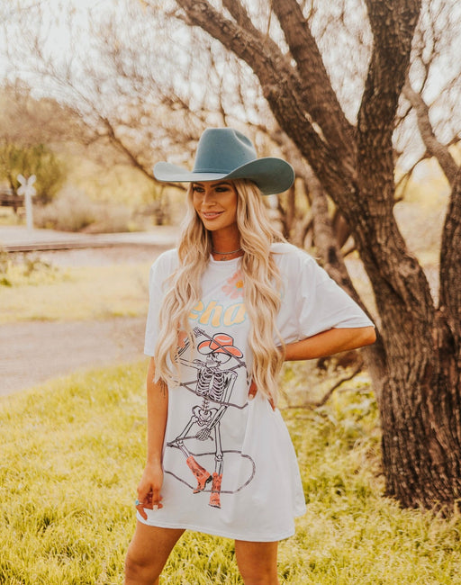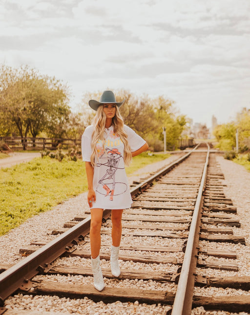 White t-shirt dress with cowgirl skeleton design! MODEL WEARING SIZE SMALL MODEL MEASUREMENTS Height: 5'7 Breast: 35.5 Waist: 26.5 Hips: 32