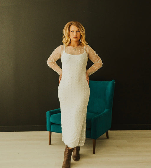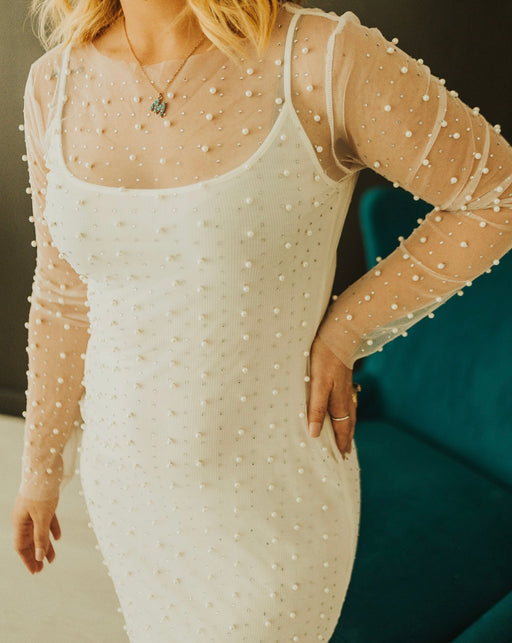 Nude mesh dress with pearls! MODEL IS WEARING SIZE SMALL MODEL MEASUREMENTS Height: 5’4 Bust : 36 Waist: 27 Hips: 33