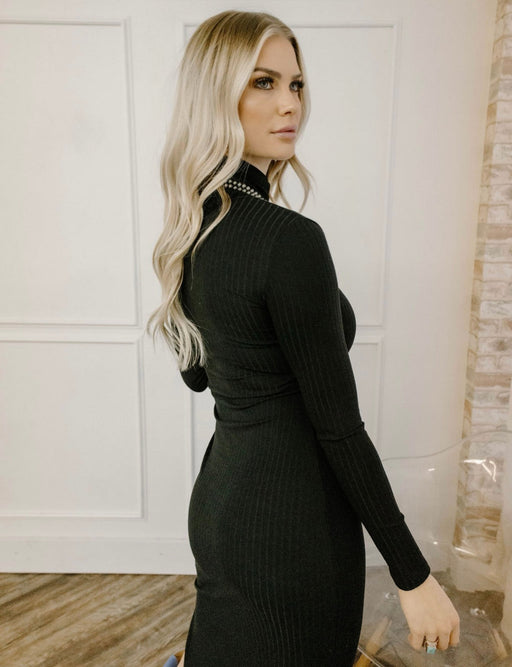 Turtle neck long sleeve black dress with side slit on both sides! MODEL WEARING SIZE SMALL MODEL MEASUREMENTS Breast: 35.5 Waist: 26.5 Hips: 32 H...