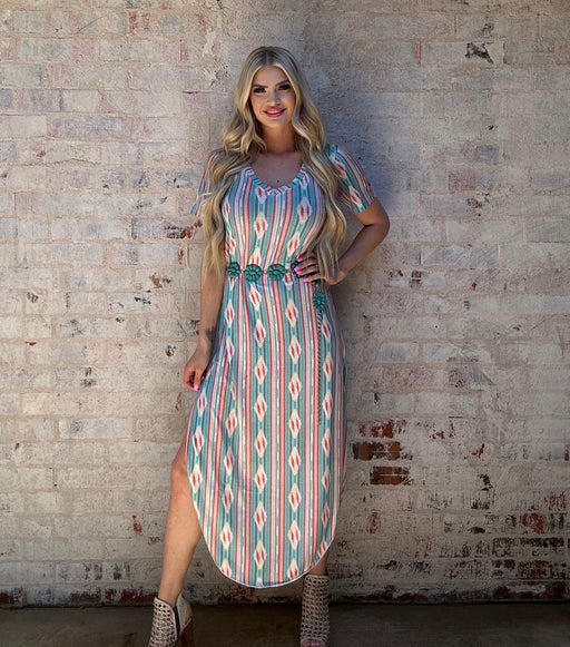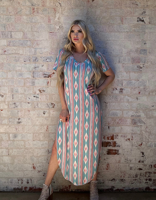 Long Aztec maxi dress with slits on each side of the leg! MODEL IS WEARING A SIZE XSMALL MODELS MEASUREMENTS Height: 5’7 Bust: 35.5 Waist: 26.5...