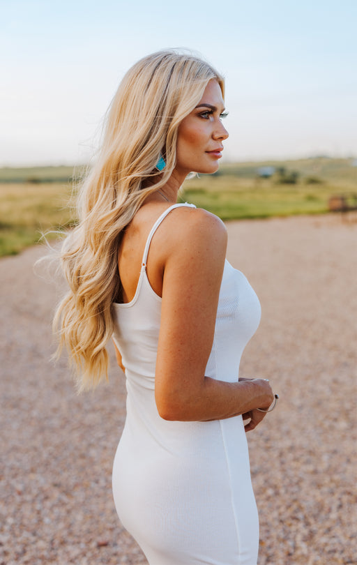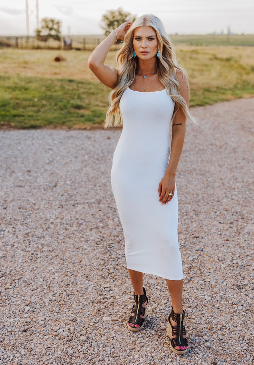 Solid ribbed soft white dress with adjustable straps! MODEL WEARING SIZE SMALL MODEL MEASUREMENTS Breast: 35.5 Waist: 26.5 Hips: 32