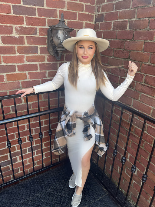 Turtle neck long sleeve cream dress with side slit! MODEL IS WEARING SIZE SMALL MODEL MEASUREMENTS Height: 5’3 Bust: 33 Waist: 26.5 Hips: 36