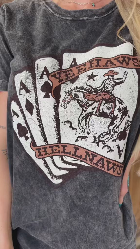 Embrace a refined Western attitude with this charcoal grey mineral washed tee, featuring a bold "Yeehaw and Hellnaw" graphic. Crafted from a soft, premium fabric, it offers exceptional comfort and a subtly distressed look that complements its rugged charm. This T-shirt effortlessly blends classic Western style with modern sophistication, making it an ideal choice for those who appreciate understated yet distinctive fashion.